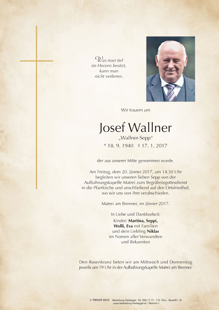 Bestattung wurde durchgeführt von: Karl Neurauter Karl Neurauter Bestattung Heidegger Brennerstraße 69 6150 - Steinach am Brenner Tel.: 05275 5211 zum Bestatter