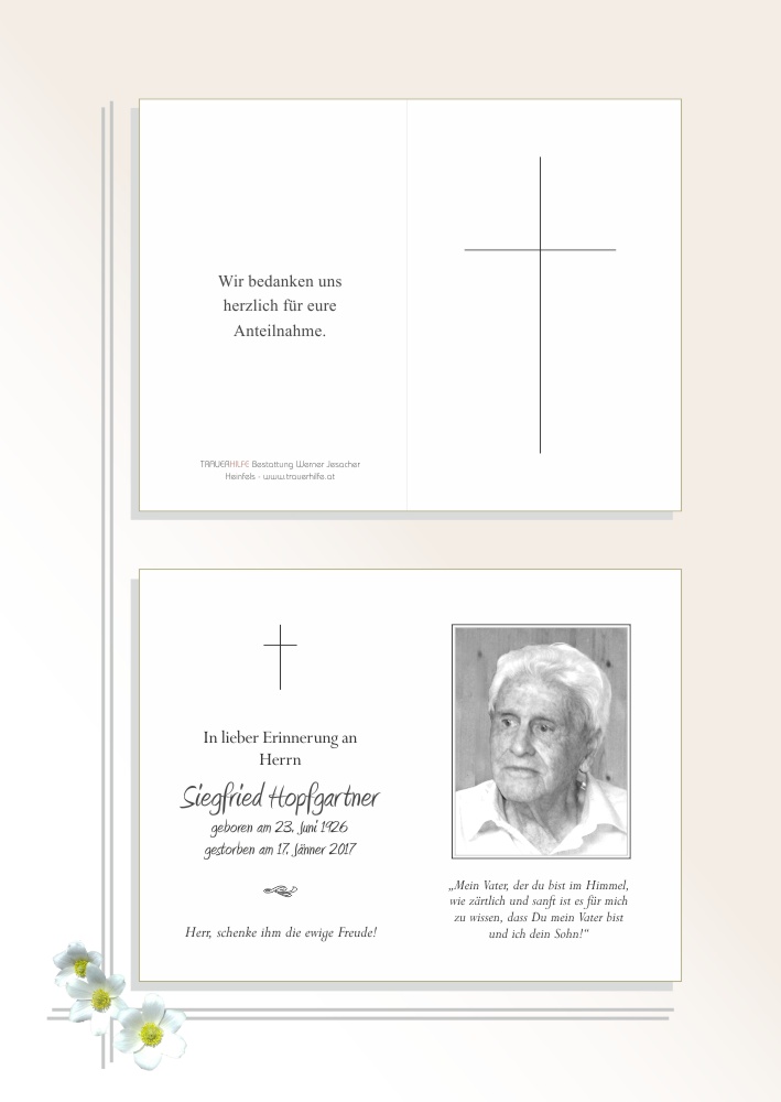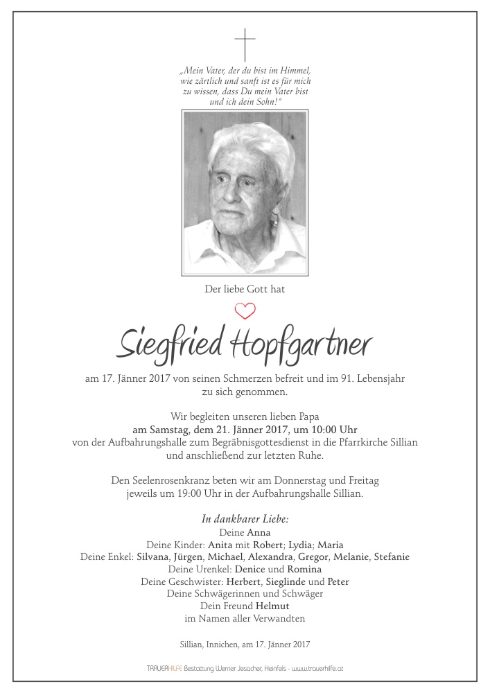 Mein Herz voller trauer weil Du nicht mehr hier bist.Für immer bist Du ein Teil von mir denn PAPA ich bin ein Teil von Dir.Ruhe sanft u.schlaf in Frieden.Hab tausend DANK für Deine MÜH. Wenn Du auch von uns bist geschieden in unsren Herzen stirbst Du nie. PAPA Du bist nie alleine. Wo ich bin da bist auch Du denn ich lieb Dich sooo sehr mei nutzo PAPA. EIN LICHT SOLL DIR LEUCHTEN IN DIE EWIGKEIT DENN ICH LIEBE DICH deine maria