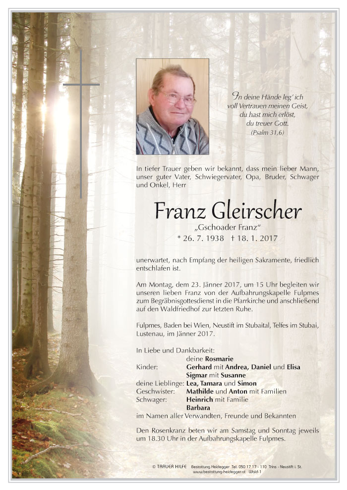 Liebe familie gleirscher! Unser herzlichstes beileid zum verlust eures mannes, papas u opas! In gedanken sind wir bei euch.
