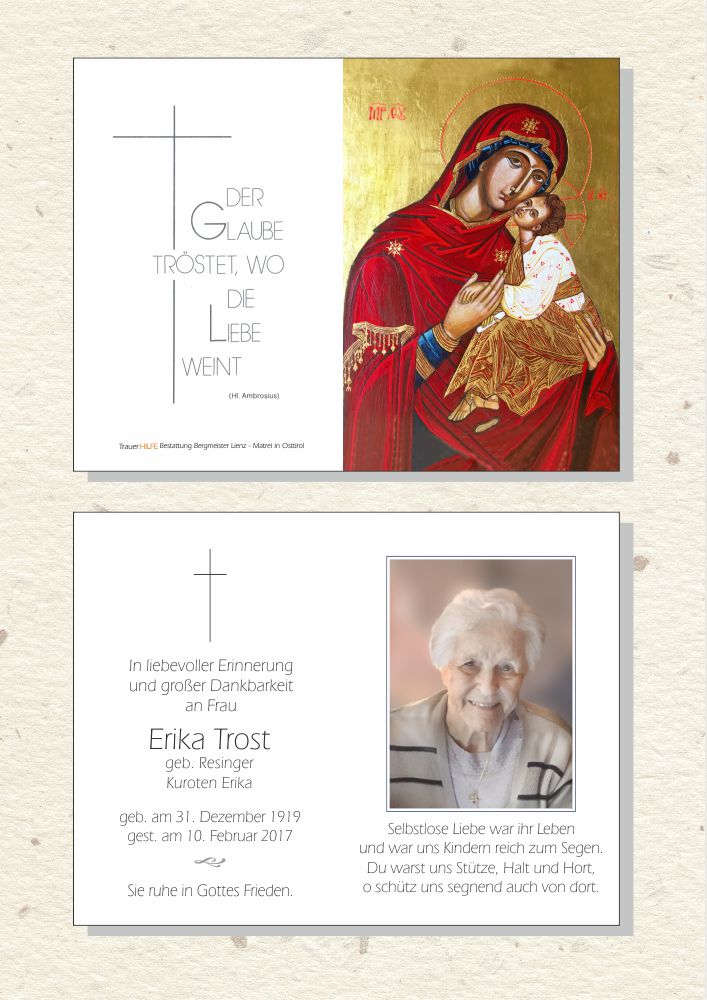 Eure Mame/Oma hat sich schon sehr auf ein Wiedersehen mit ihren Büebn und den Tatn gefreut. Trotz der vielen Schicksalsschläge hat sie nie ihren Humor und vor allem ihren Glauben verloren. Sie war eine feine Nachbarin und wir haben gerne mit ihr gehoangaschtet, wenn sie auf der Hausbank gsessen isch, oder einfach beim Fenster eichn gewunken, wenn wir vorbei gongen seibm. Mit einem lochentigen Gsicht hot sie olbm zruckgewunken. Enk olln viel Kraft in dieser schweren Zeit des Abschiednehmens. Auch wenn wir ihr die wohlverdiente Ruhe gönnen, ist unser Herz traurig, dass wir sie gehen lassen müssen.