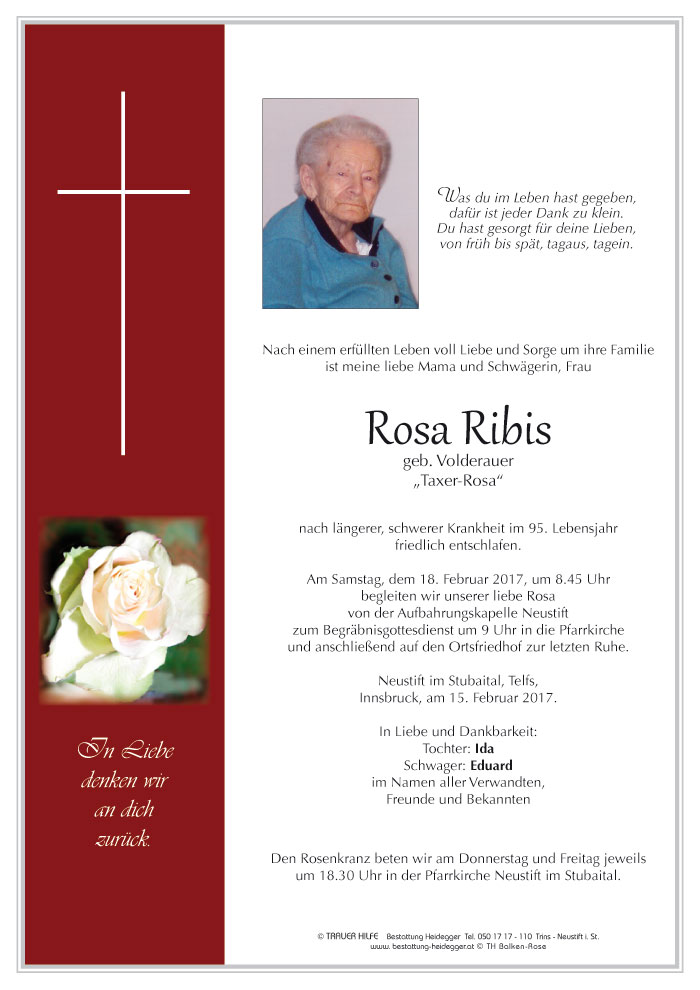 Bestattung wurde durchgeführt von: Karl Neurauter Karl Neurauter Bestattung Heidegger Brennerstraße 69 6150 - Steinach am Brenner Tel.: 05275 5211 zum Bestatter