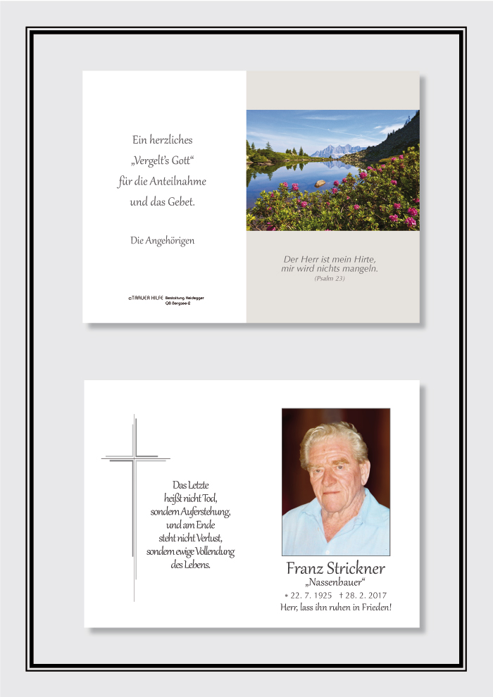 Bestattung wurde durchgeführt von: Karl Neurauter Karl Neurauter Bestattung Heidegger Brennerstraße 69 6150 - Steinach am Brenner Tel.: 05275 5211 zum Bestatter