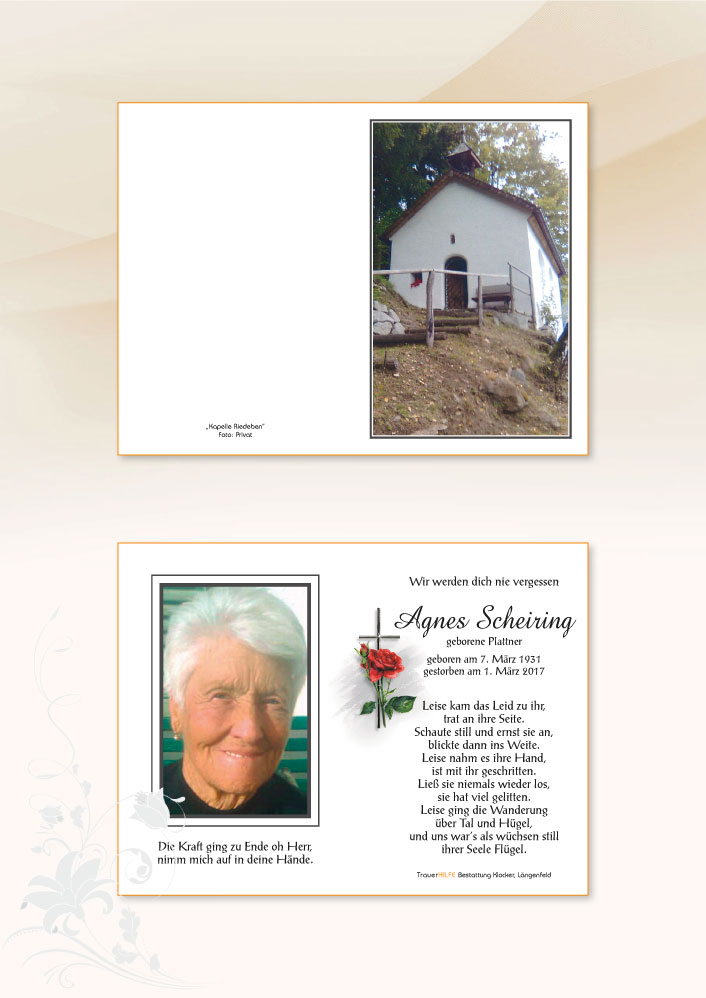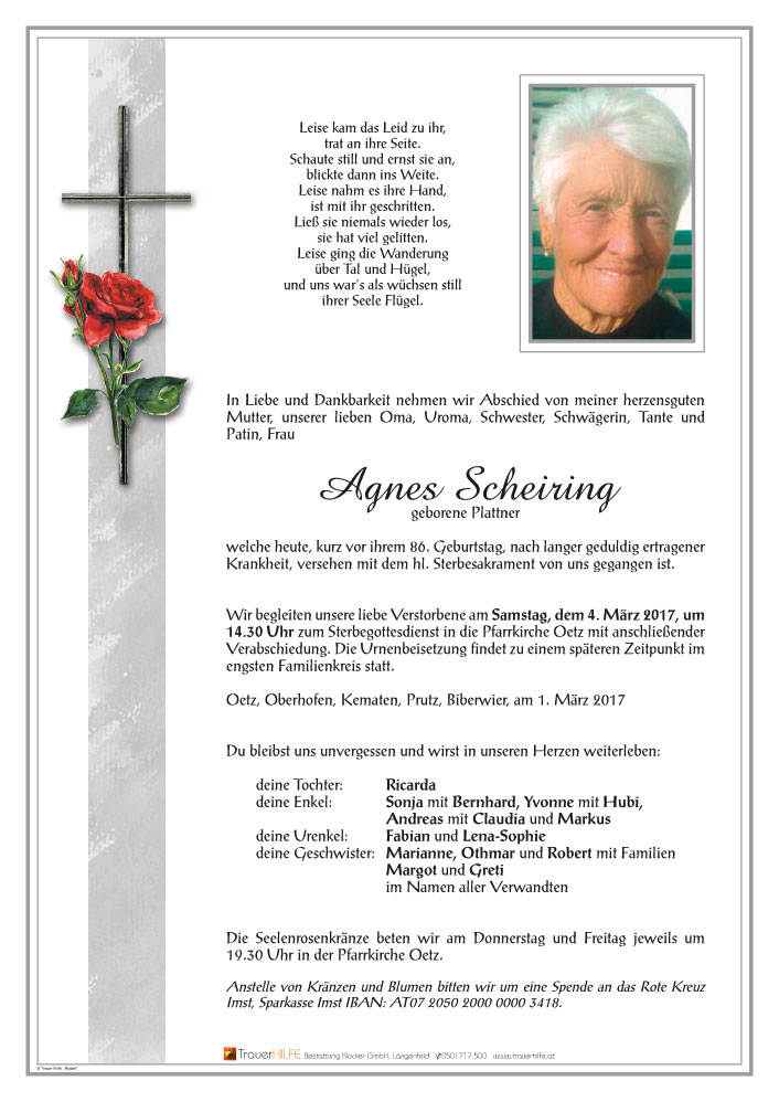 LIEBE OMA AGNES ICH FINDE KEINE WORT DU WARST IMMER EINE GUTE MUTTER UND FREUNDIN ZU UNS UND DAFÜR 1000 DANK WERDE DICH EUCH NIE VERGESSEN WARD IMMER GUT ZU MIR RUHE IN FRIEDEN MARGOT MIT FAM