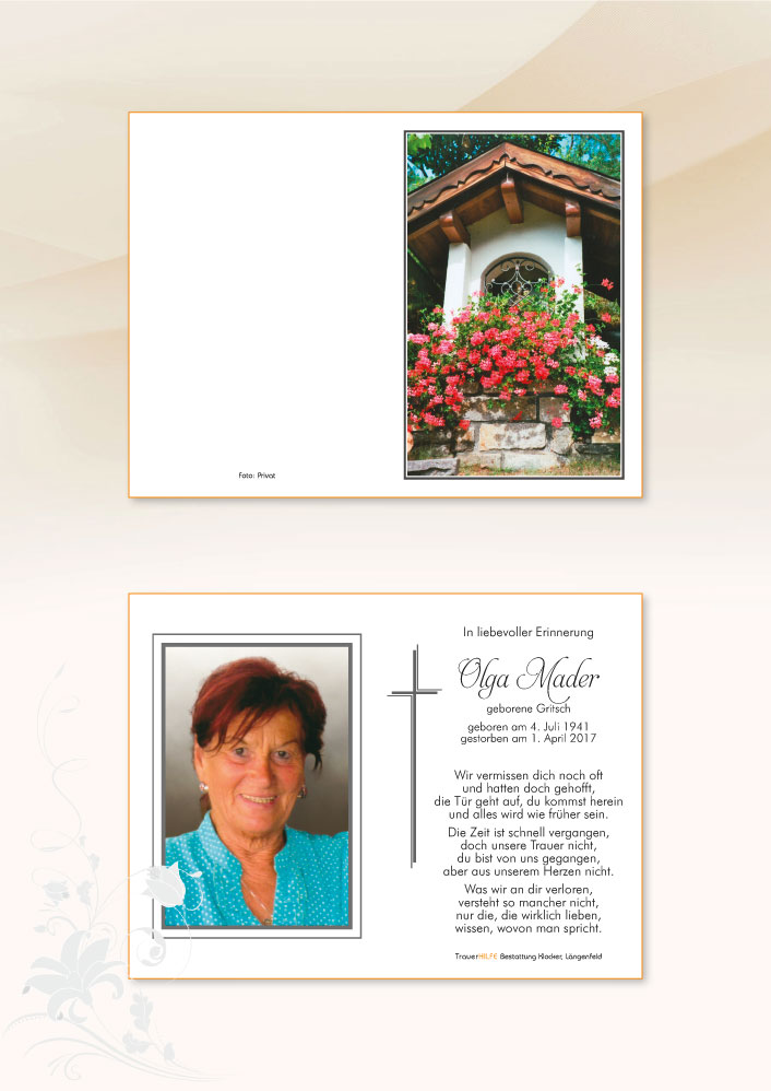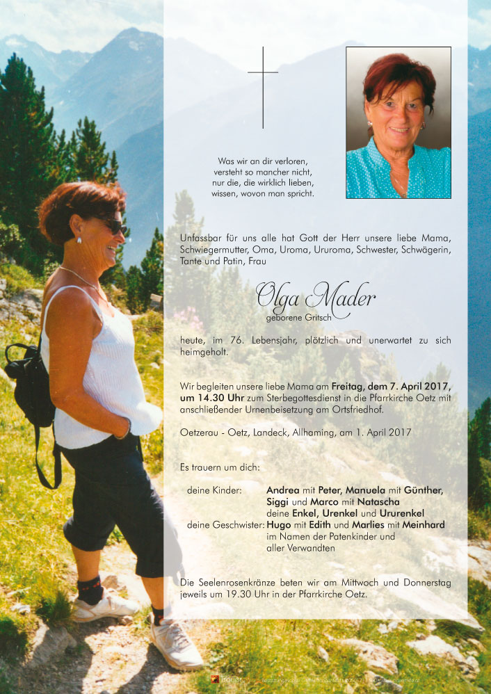 wir sind sehr erschüttert über den plötzlichen Tod Eurer geliebten Mama Olga. Unsere aufrichtige Anteilnahme sowie viel Kraft für die schweren Stunden der Trauer und des Abschieds.07.04.2017 10:55 - Barbara & Michl