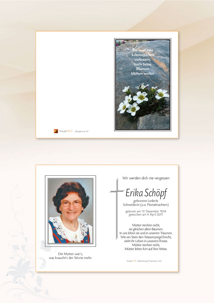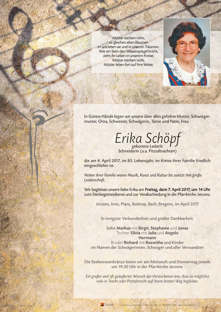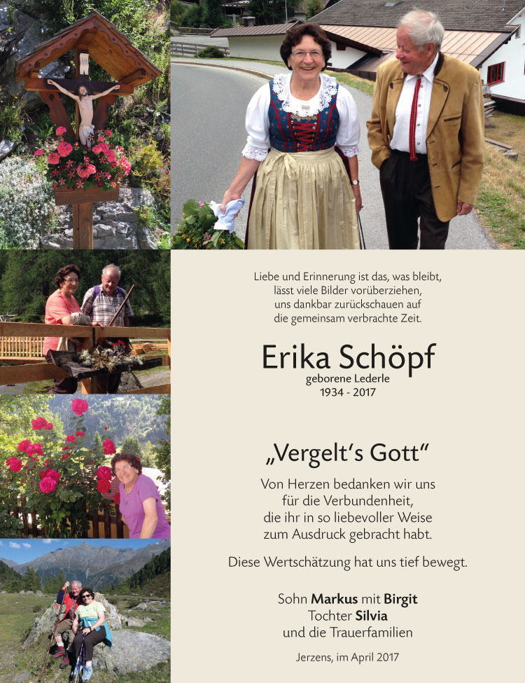 Wir haben Erika als eine lebensfrohe Frau kennen und lieben gelernt. Sie wird nicht nur in eurer Familie eine Lücke hinterlassen, sondern in eurem Pitztal, an vielen Stellen ihre Hilfsbereitschaft und Heimatverbundenheit vermissen.