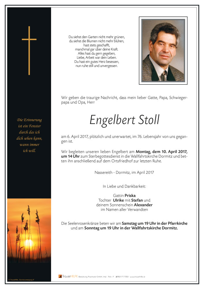 In diesen für Euch so schweren Tagen können wir Euch nur viel Kraft wünschen, wohlwissend, dass Wünsche immer Wünsche bleiben und nur die Zeit vermag, Wunden einigermaßen zu schließen. Engelbert hat jetzt sicher seinen Frieden gefunden und wird in unserer Erinnerung weiterleben. Unsere Gedanken sind bei Euch. Aufrichtige Anteilnahme von Midi, Thomas und Peter.07.04.2017 21:56 - Fam. Simon
