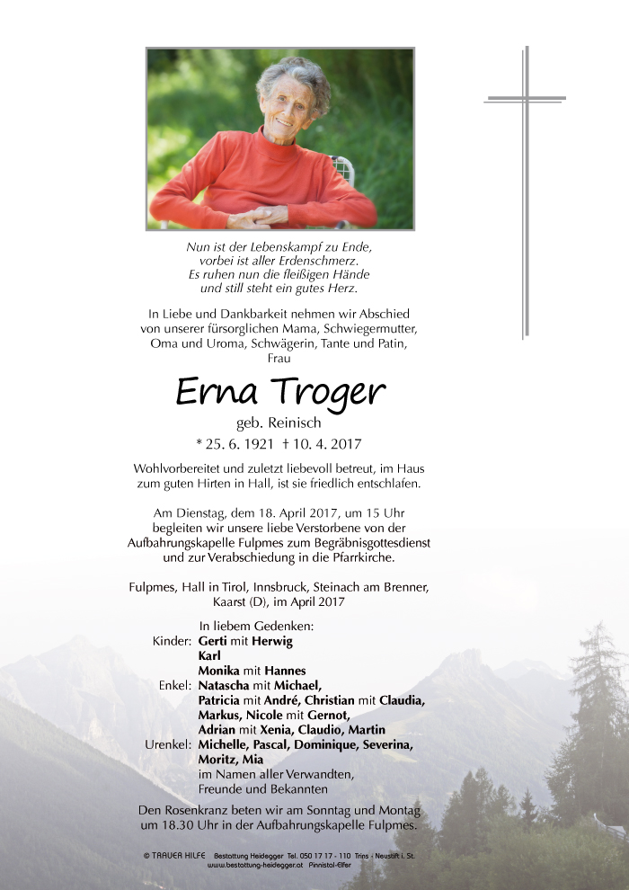 Ich werde Frau Troger als liebevolle und korrekte Mutter mit viel Weitblick und Entschlusskraft in Erinnerung behalten.