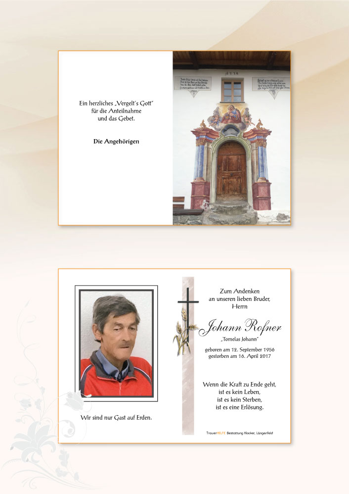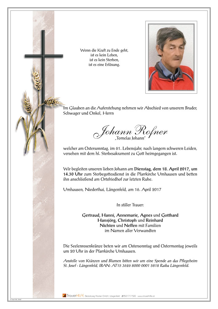 Aufrichtige Anteilnahme am Tode Eures lieben Johann entbieten Familie Scharfetter