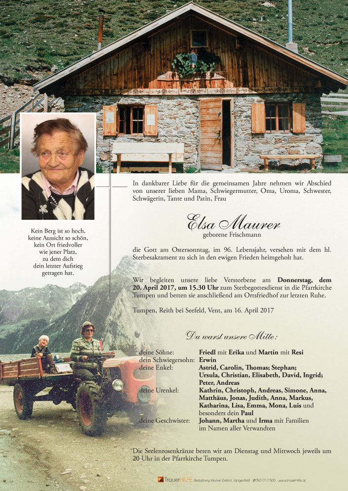 Aufrichtige Anteilnahme am Tode Eurer lieben Elsa entbieten Familie Scharfetter, Gasthof Andreas Hofer Umhausen.17.04.2017 20:56 - Familie Scharfetter
