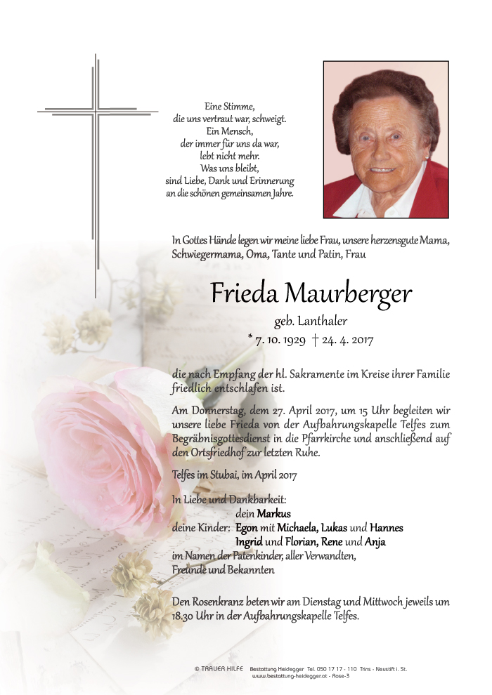 Friedhof Telfes im Stubaital, † 24.04.2017 (87 Jahre)