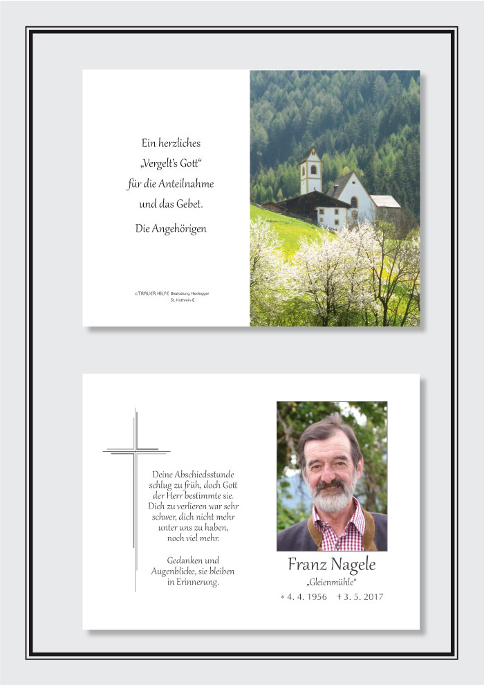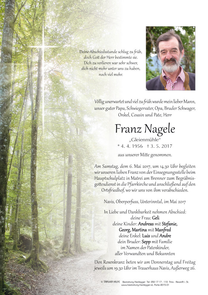 Bestattung wurde durchgeführt von: Karl Neurauter Karl Neurauter Bestattung Heidegger Brennerstraße 69 6150 - Steinach am Brenner Tel.: 05275 5211 zum Bestatter