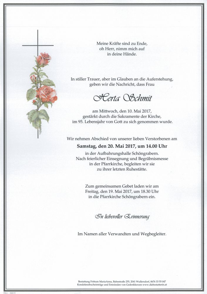 Bestattung wurde durchgeführt von: Frittum Maria Anna TrauerHilfe Bestattung Frittum Bahnstrasse 255 2041 - Wullersdorf Tel.: 050 1717-600 zum Bestatter