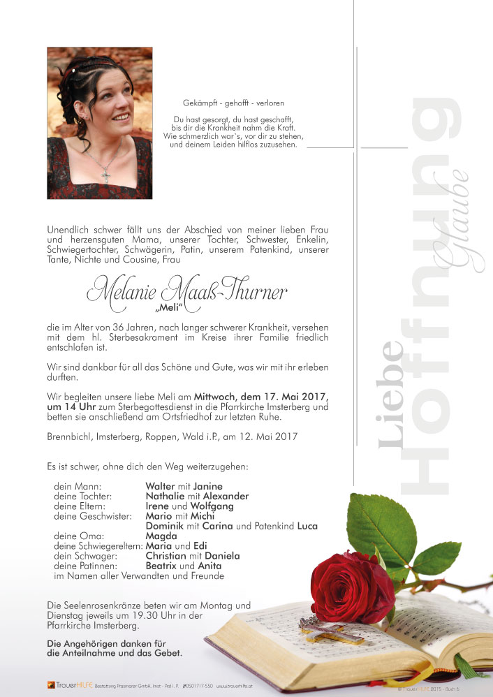 Liebe Trauerfamilie, mein tiefstes Beileid! Gekämpft - gehofft- verloren, diese Worte tregfen es auf den Punkt, mehr gibt es nicht zu sagen... Meli, war ein super Mensch und ich bin froh, dass ich sie kennen lernen durfte! Wir haben viele schöne Stunden miteinander verbracht und die möcht ich nie missen... Lieber Walter, liebe Natalie, liebe Eltern und Brüder, ich teile euren Schmerz, weil Meli war echt ein besonderer Mensch und es ist schwer so einen Menschen gehen zu lassen... vorallem viel zu früh... Sie hat bis zum Schluss gekämpft und sie war eine starke Persönlichkeit und ich hoffe bzw. ich weiß, dass es ihr jetzt sicher gut geht und sie von ihren Qualen erlöst ist! Ich wünsche euch viel Kraft und denke an euch...