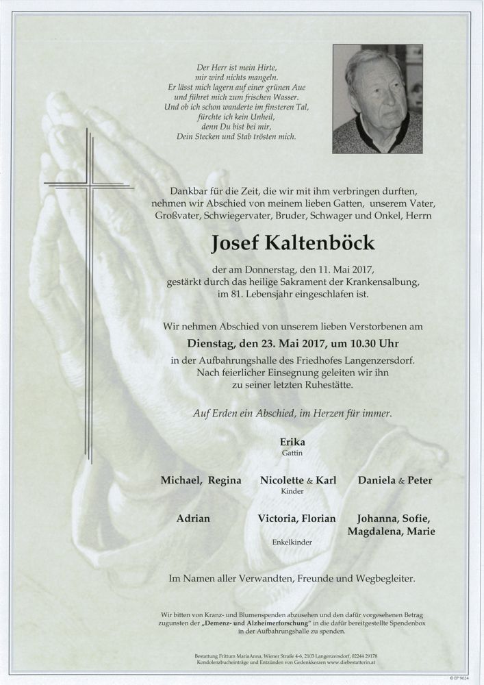 Bestattung wurde durchgeführt von: Frittum Maria Anna TrauerHilfe Bestattung Frittum Bahnstrasse 255 2041 - Wullersdorf Tel.: 050 1717-600 zum Bestatter
