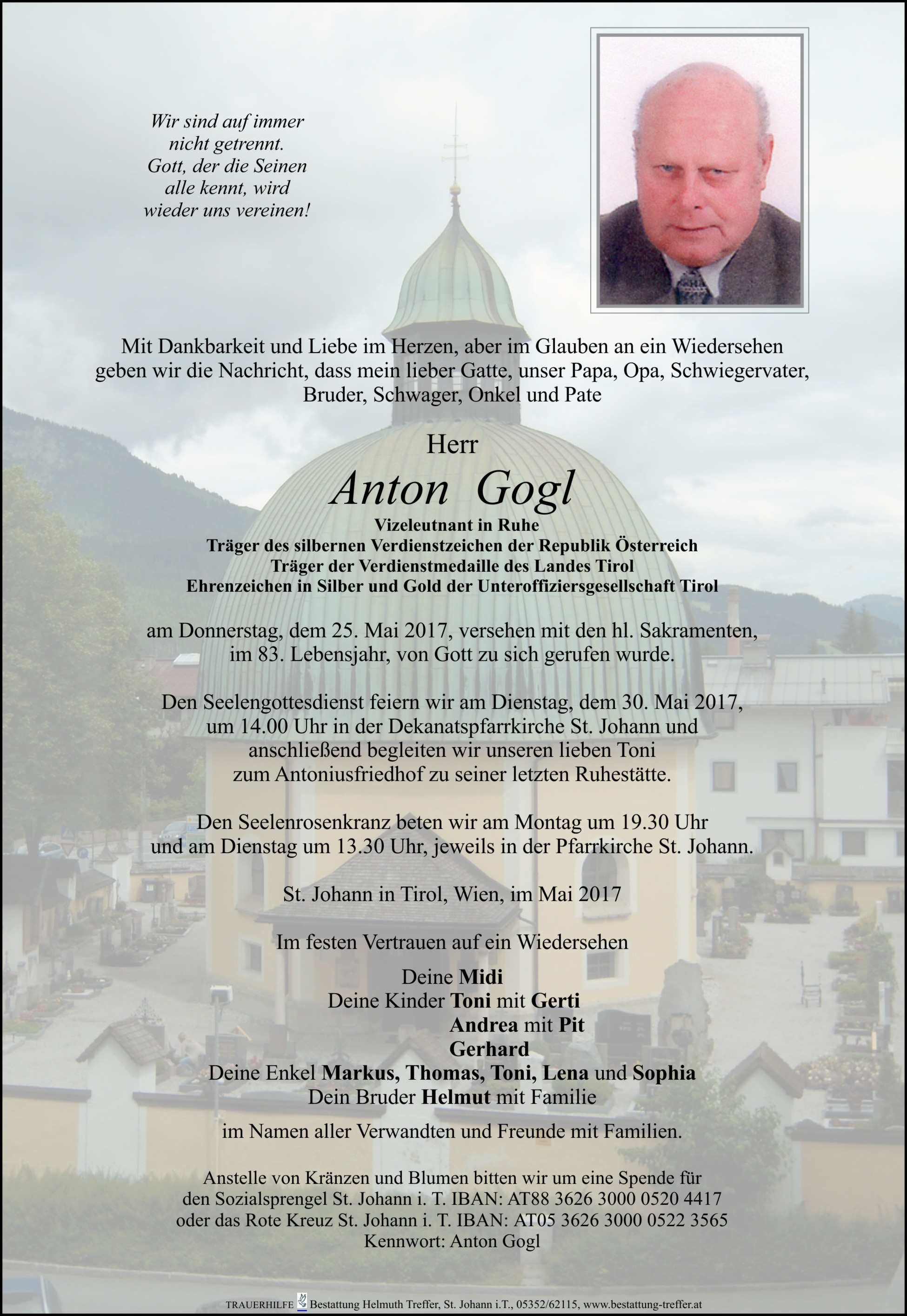 Als Soldat aus der Wildschönau im Jahr1965 möchte ich mich für seine Gütige Art und weise mir gegenüber den Toni nochmals Danken. Der Herrgott wird ihn in sein Reich für sein Wirken gut aufnehmen können.