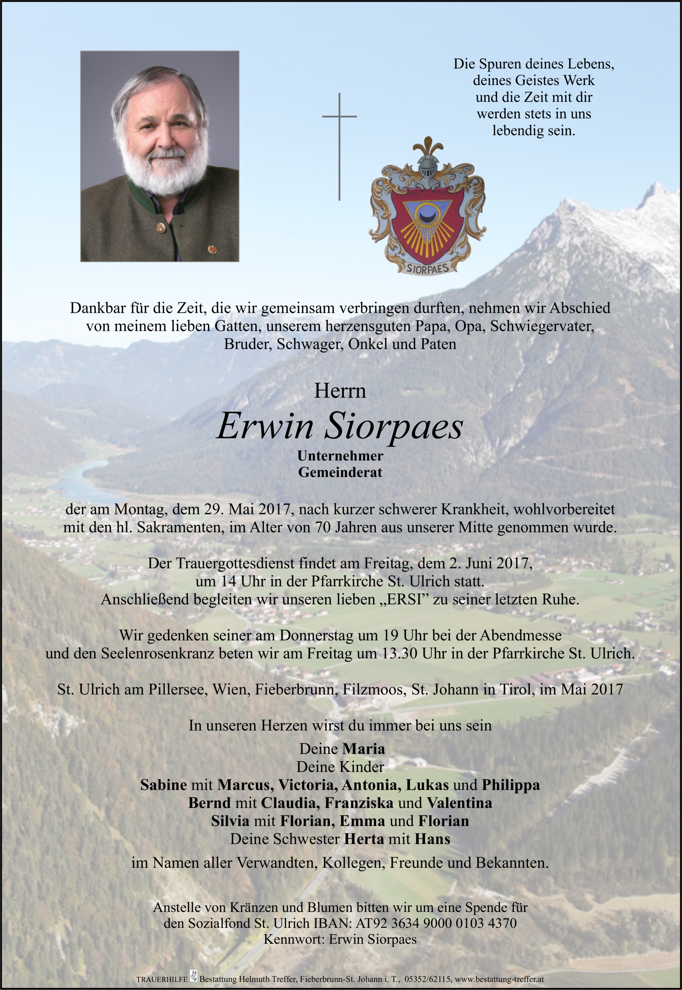 Liebe Familie Siorpaes, wir möchten hiermit unsere Anteilnahme aussprechen. Es gibt wahrscheinlich nichts was an solchen Tagen tröstet oder hilft. Wir wünschen Euch viel Kraft in den nächsten Wochen und Monaten. Wir werden Erwin in guter Erinnerung behalten, soviele Jahre haben wir uns immer wieder, jeden Monat über den Pillersee-Boten und somit ein Stückchen Heimat gefreut und Erwin war dafür verantwortlich. Vielen Dank dafür und Ruhe in Frieden lieber Ersi!