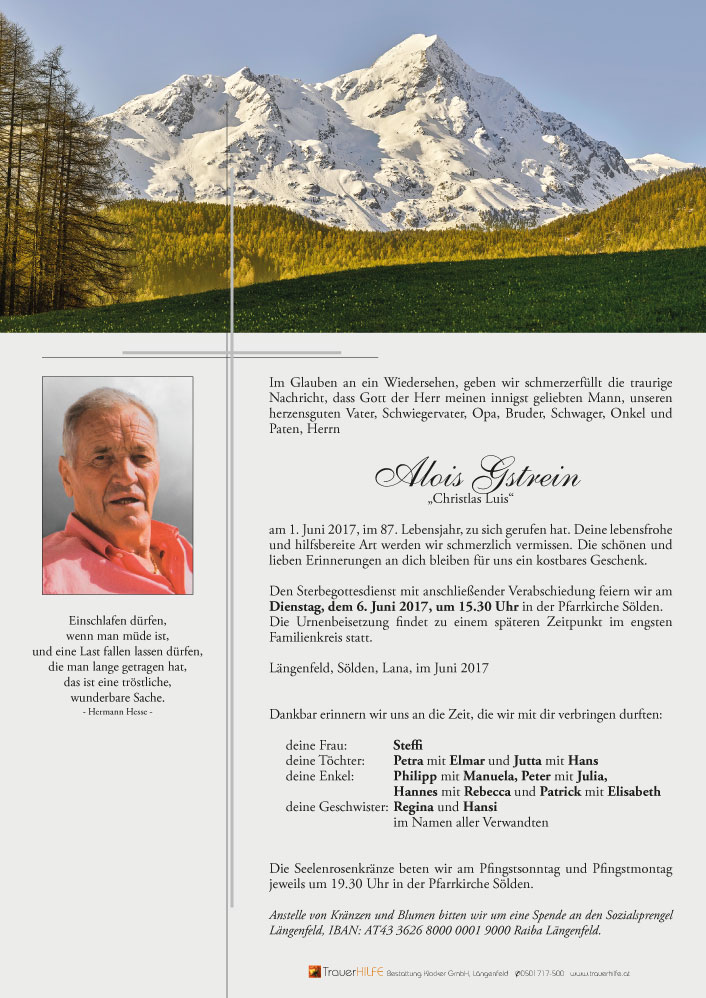Wir gedenken euren Lois bei einer heiligen Messe in Längenfeld.