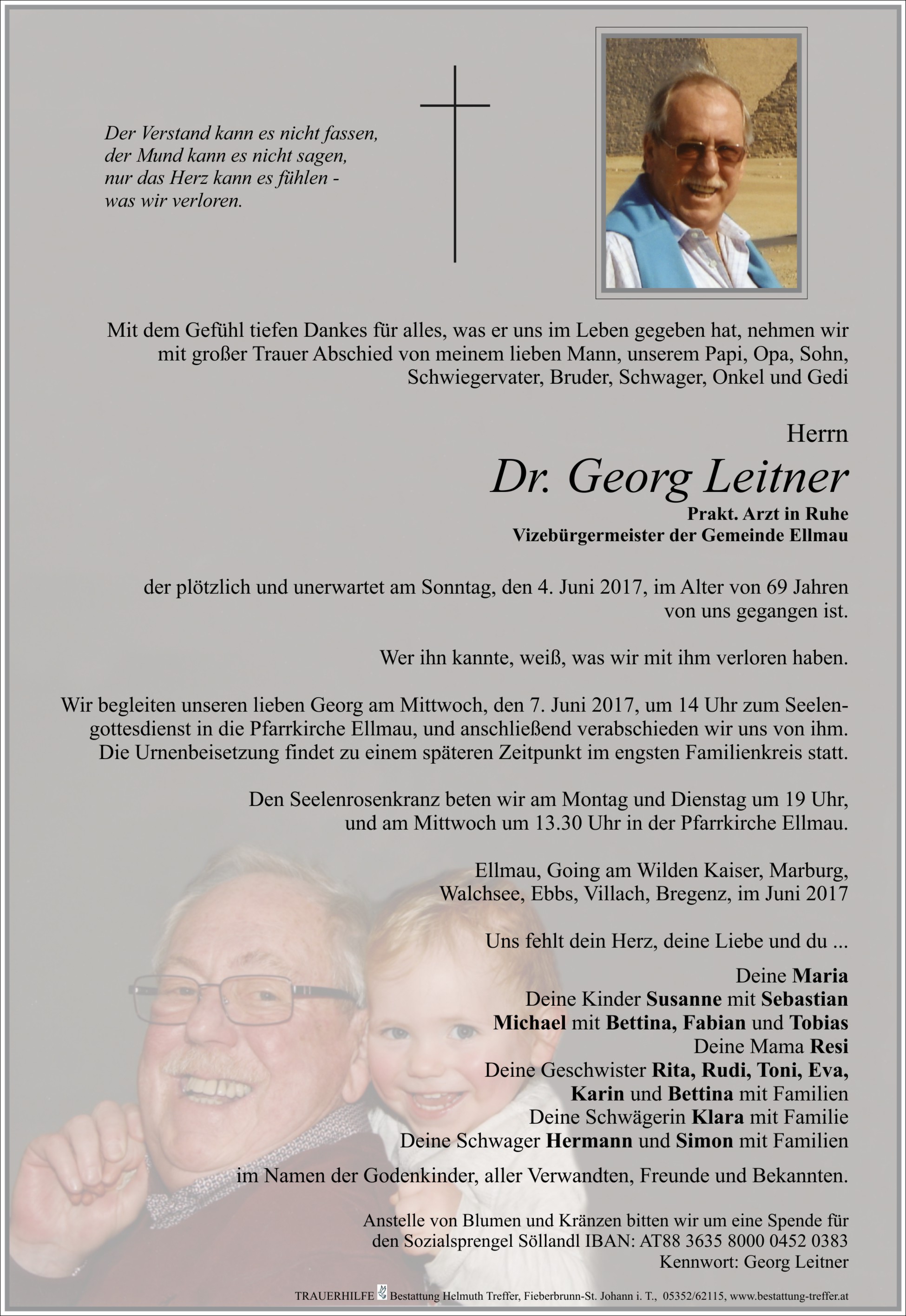 Herr Dr. Georg Leitner hat vor ca. 2 Jahren bei mir begonnen Steirische Harmonika zu lernen und es war jedes Mal ein Erlebnis mit ihm zu spielen. Vor allem mit welcher Liebe und Leidenschaft er in seinem Alter noch Musik gespielt hat. Umso mehr trifft mich sein plötzlicher Tod. Mein Mitgefühl ist bei euch. Ich werde ihm in aller Stille sein Lieblingsstück spielen. Hubert Fuchs (Ziachfuchs)07.06.2017 12:35 - Hubert Fuchs (Ziachfuchs)