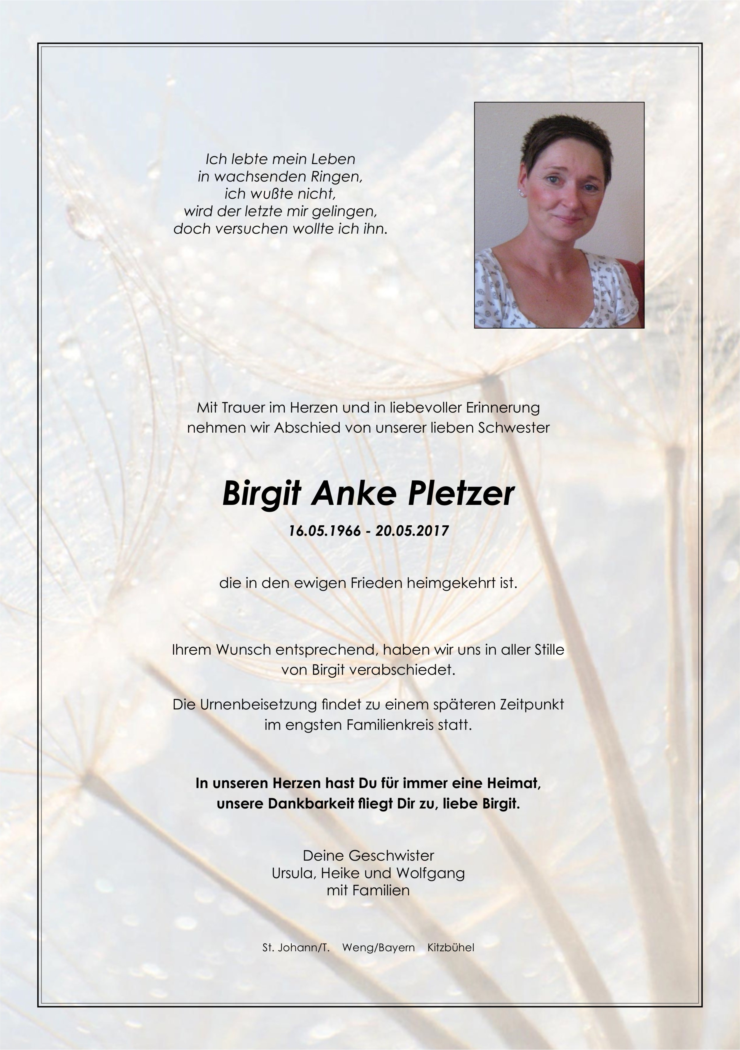 Liebe Birgit auch ich möchte mich auf diese Weise von dir verabschieden. Es war mir eine Freude dich zu kennen. Du warst und bist eine besondere Seele. Wir werden uns bestimmt wieder sehen. Wir kannten uns schon als Kinder, als Teenager sind wir auch manchmal zusammen gekommen und hatten es sehr lustig, wir waren später Arbeitskollegen , wir haben uns immer wieder getroffen und das war gut so! Ich wünsche dir das es dir gut geht, du würdest bestimmt sagen ein softes Wölkchen zum sitzen und runterschauen wünsche ich mir, das ich euch alle sehen kann. Karin
