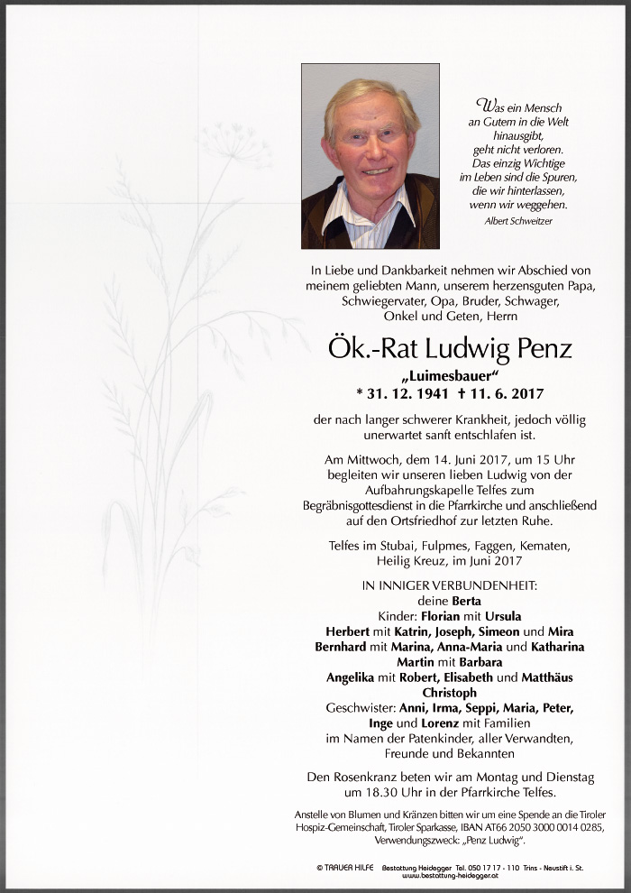 Es ist immer zu früh, wenn ein Elternteil geht. Auch wenn es Zeiten gibt, in denen man hofft, dass der Mensch von seinem Leiden erlöst wird. Ich behalte Ludwig Penz als eine Persönlichkeit in meiner Erinnerung, der immer in seiner ruhigen und besonnen Art versucht hat, den Menschen in Wertschätzung zu begegnen - ich durfte Ludwig Penz 10 Jahre als Kammerpräsident erleben, er hat in meiner Rolle als seine Mitarbeiterin immer Stütze und Rat gegeben. Danke, dass ich dich kennen lernen durfte. Ruhe in Frieden. Der Familie auf dem letzten gemeinsamen Weg des Abschiedes viel Kraft und Gottes Segen. ich bin in Gedanken bei euch.