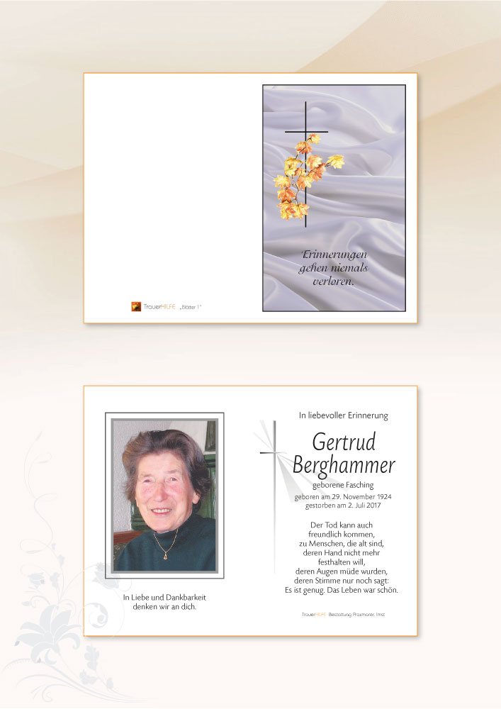 Es falten sich der Mutter Hände, die stets gesorgt für euer Wohl, die fleißig waren bis zum Ende, nun ruhen Sie still und friedevoll.