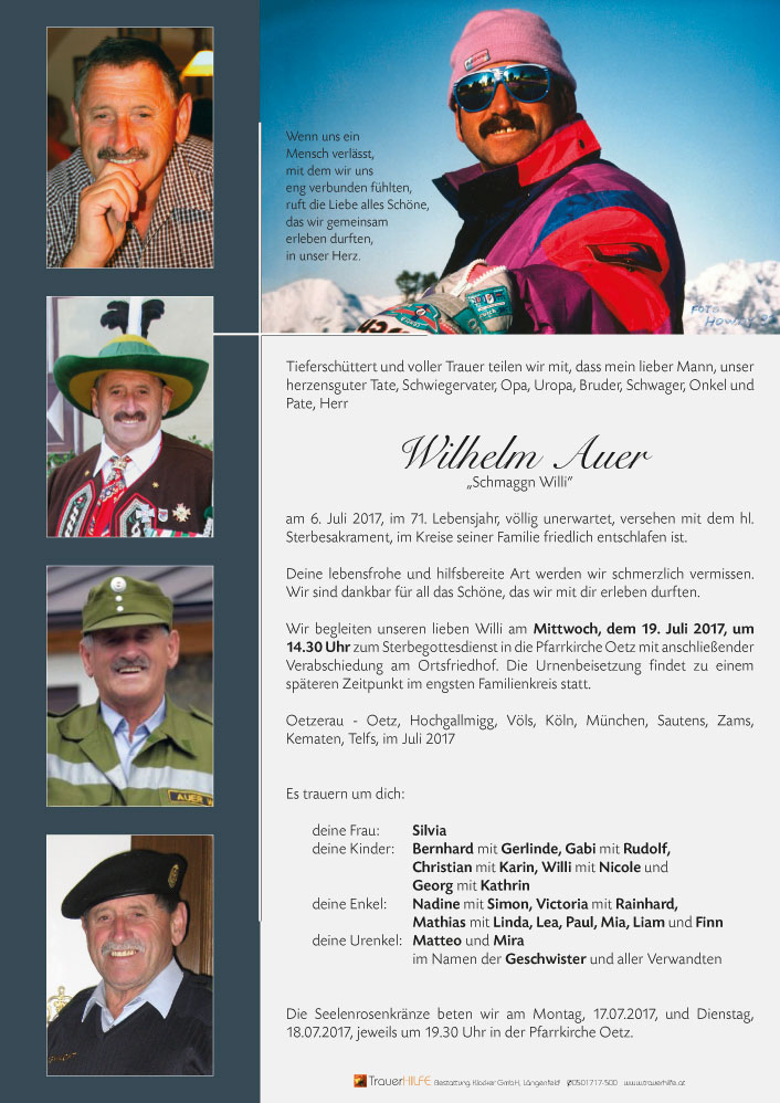 Gänzlich unerwartet haben wir die Nachricht vom Tod meines Onkels Willi zur Kenntnis nehmen müssen. Uns bleibt nur Danke zu sagen. Willi - danke für die Zeit mit dir und die vielen schönen Augenblicke. Du hast mir viel gezeigt - auf der Skipiste und am Bau. Wenn wir uns den von dir von unserer Hochzeit aufgenommenen Film ansehen, werde wir immer an dich denken.