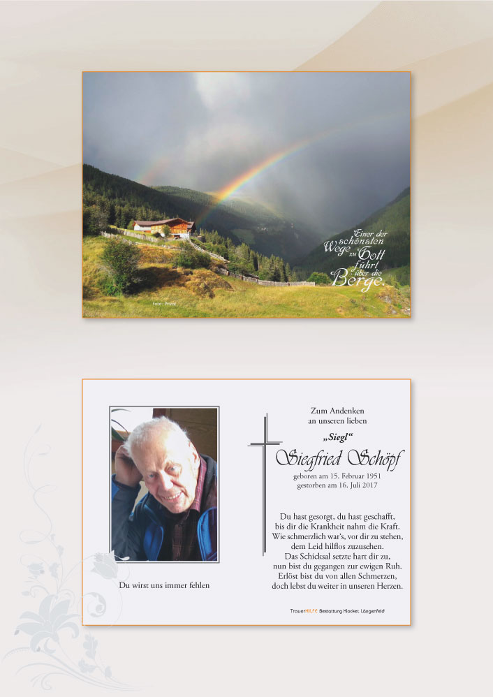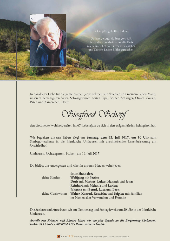 Dein Tod lieber Siegi, soll uns Lebende daran erinnern, dass wir alle endlich sind....und wir sollen jeden Tag so gut es geht genießen und ihn zum besten unseres Lebens machen...