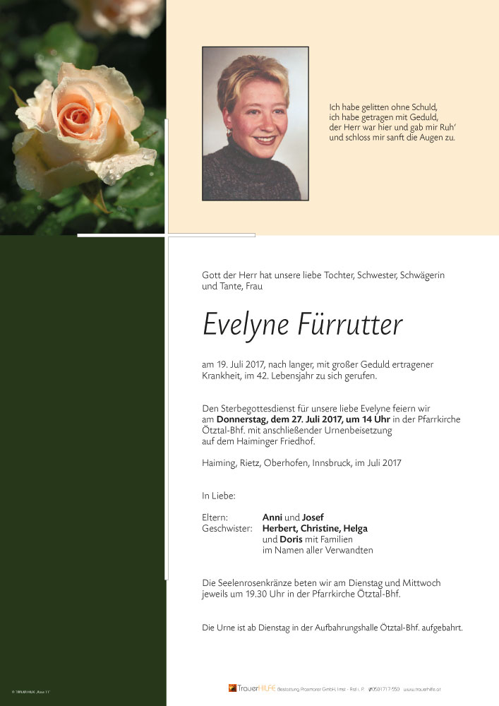 Liebe Trauerfamilie, ich wünsche euch viel Kraft in dieser schweren Zeit.21.07.2017 14:31 - Ruhe in Frieden liebe Evelyne
