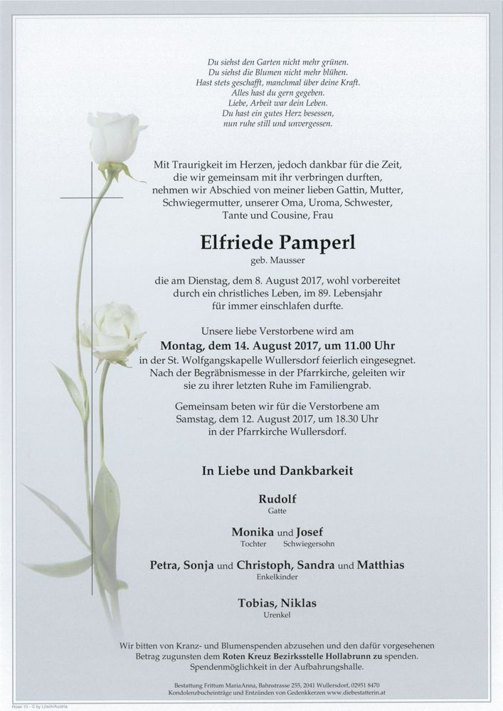 Bestattung wurde durchgeführt von: Frittum Maria Anna TrauerHilfe Bestattung Frittum Bahnstrasse 255 2041 - Wullersdorf Tel.: 050 1717-600 zum Bestatter