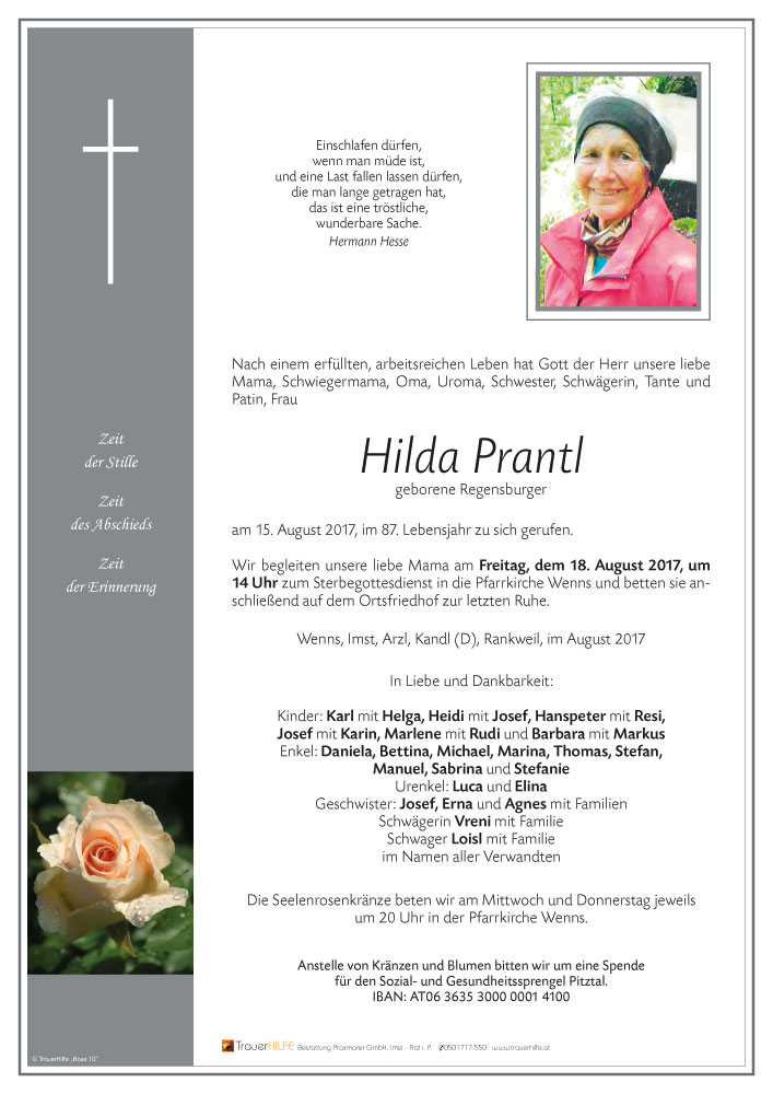 Aufrichtige Anteilnahme zum Tod und Heimgang eurer Mama und Oma Hilda entbietet Fam. Scheiber Gerold, Erika, Dominik, Benedikt und Lukas aus der Nachbarschaft..16.08.2017 15:35 - Lukas Scheiber