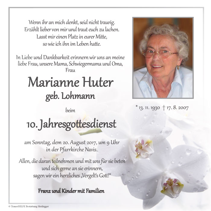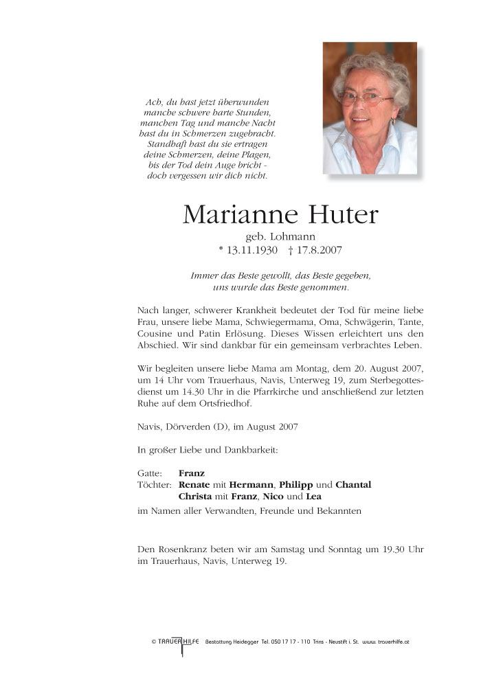 Bestattung wurde durchgeführt von: Karl Neurauter Karl Neurauter Bestattung Heidegger Brennerstraße 69 6150 - Steinach am Brenner Tel.: 05275 5211 zum Bestatter