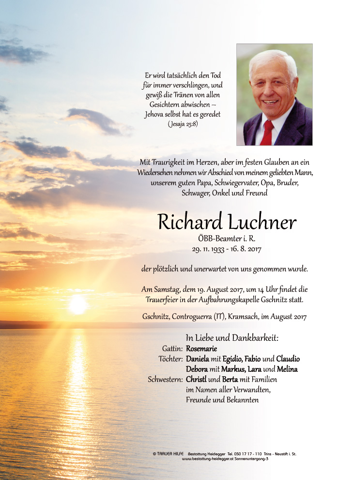 Bestattung wurde durchgeführt von: Karl Neurauter Karl Neurauter Bestattung Heidegger Brennerstraße 69 6150 - Steinach am Brenner Tel.: 05275 5211 zum Bestatter