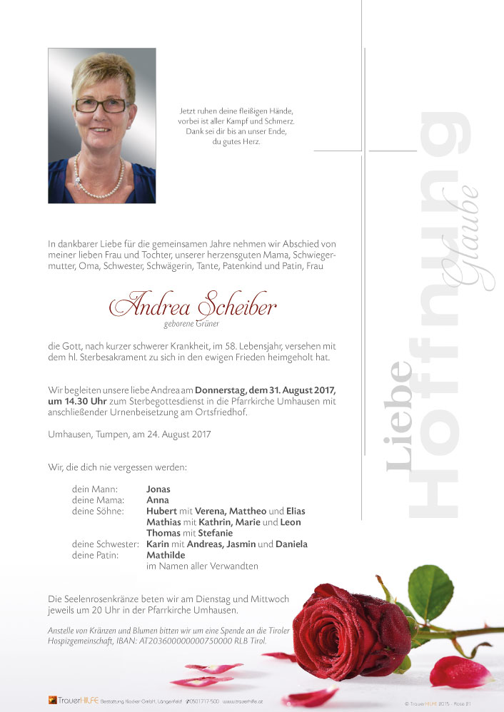 Der schnelle Tod von Andrea tut unbeschreiblich weh, aber wir danken Gott für die Hilfsbereitschaft, die netten Stunden und ratscher die wir mit Andrea verbringen durften. Aufrichtiges Beileid und viel, viel Kraft für die kommende schwere Zeit.27.08.2017 18:38 - Friederike,Hansjörg, Marie-therese u. Markus