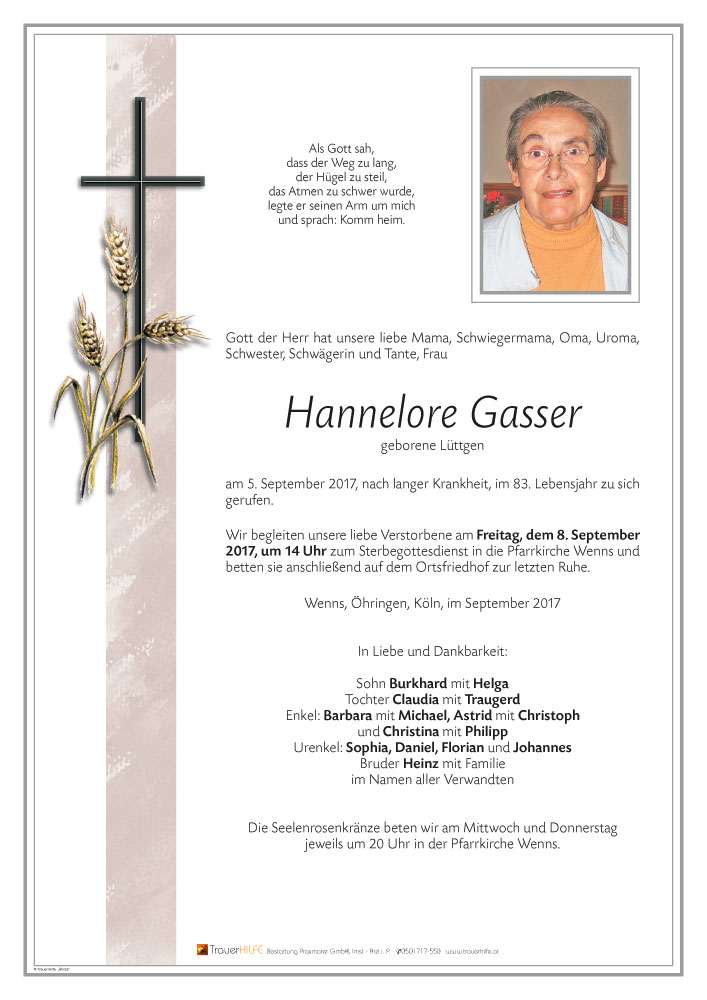 Mit tiefem Respekt, Anerkennung und Wertschätzung haben wir die jahrelange Pflege eurer Mama verfolgt. Die aufopfernde Pflege hat von euch viel Kraft und Einsatz gefordert. Ihr habt dies mit Hingabe und Liebe getan. Trotz Schicksalschlägen habt ihr immer euren Humor, eure Offenheit und Freundlichkeit beibehalten. Eure Familie hat euch immer viel Kraft gegeben und einen unglaublichen Zusammenhalt. Dazu hat euch auch unser Herrgott Beistand geleistet.