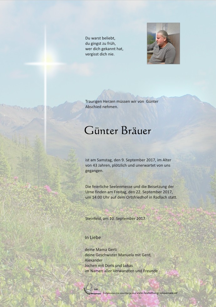 Nix werd mehr so sein wies woa. Du bist nimma. A Riesenloch host aufgeton des nie mehr zugehn werd. Du werst überoll fahln, weil du a Teil von uns woast. Danke für dei ehrliche Freundschaft, danke für dei großes Herz, danke, dass du, du woast. Pfiati Günter mei Freund!