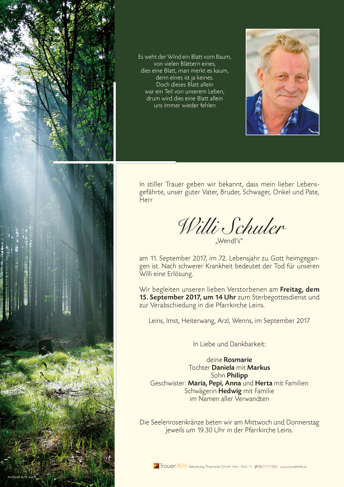 Lieber Willi, ich erinnere mich heute noch gerne an unsere Kindheit in Grapichl. Du warst als mein Onkel nur ein paar Jahre älter als ich!