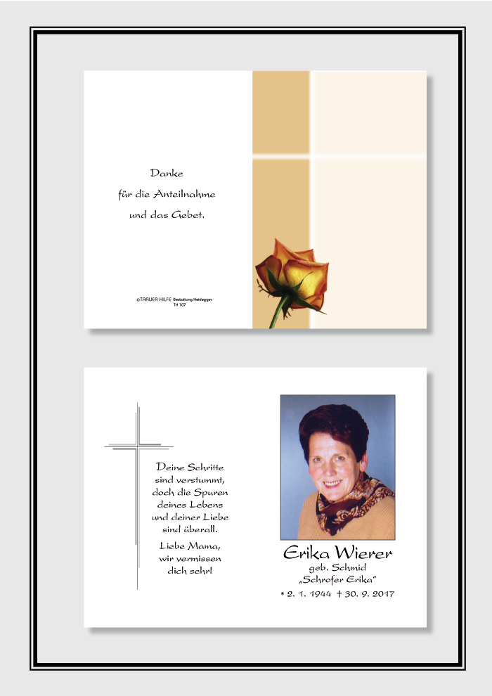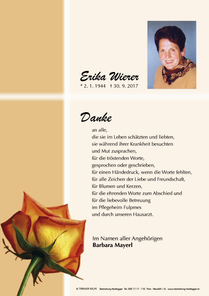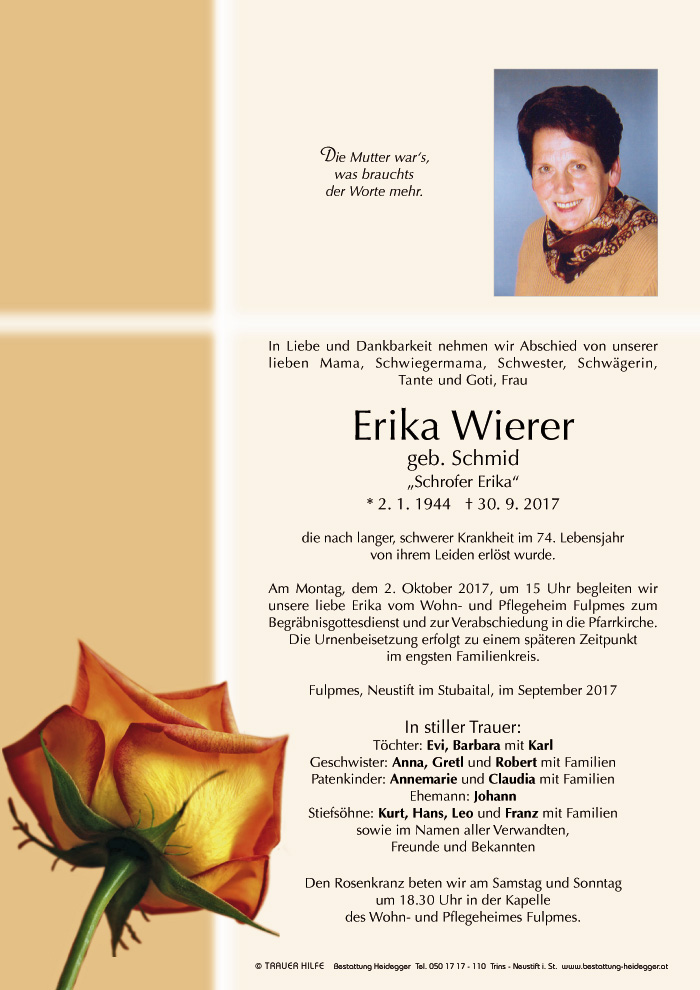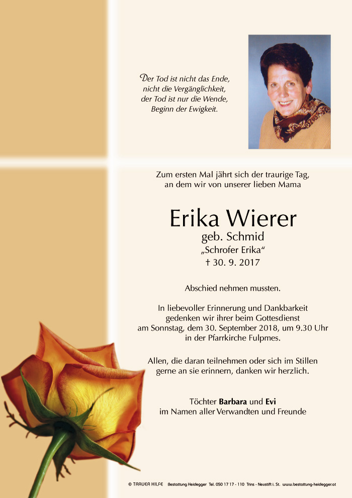 Liebe trauernde Angehörige. Ich spreche Euch mein herzliches Beileid zum Heimgang von Erika aus. Sie war eine der letzten Freundinnen meiner Mama, welche am 7.7.2017 vorausgegangen ist. Oft hat sich Erika bei ihr gemeldet und nachgefragt, wie es ihr geht. Trotz ihrer schweren Krankheit hat sie ihren Humor immer bewahrt. Nun sind beide von Leid und Schmerz befreit... Siegfried Eller