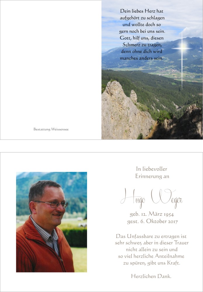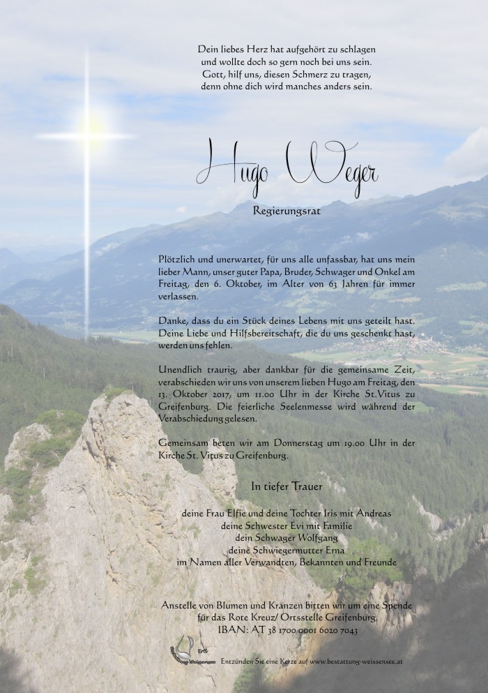 Ist die Sonne so plötzlich aus eurem Leben verschwunden, so suchet den Stern den jemand eigens für euch entzündet! Möge euch die Erinnerung an den lieben Hugo begleiten, wie ein wärmender Sonnenstrahl. Aufrichtige Anteilnahme und viel Kraft und Stärke den trauernden Angehörigen für diese schwere Zeit! Martina Winkler & Fritzer Gerti