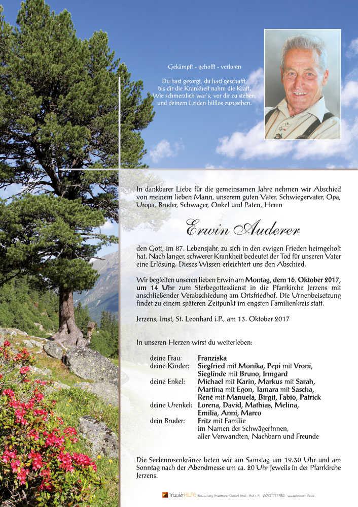Nur zugute können wir euren Schmerz nachvollziehen. Wir wünschen euch viel Kraft in dieser schweren Zeit. Onkel Erwin wird uns in schöner Erinnerung bleiben. Jetzt ist er wieder bei Reinhard und Bruder Engel. Im Gedanken bei euch.. Liesi und Bella13.10.2017 15:07 - Fam. Lechthaler