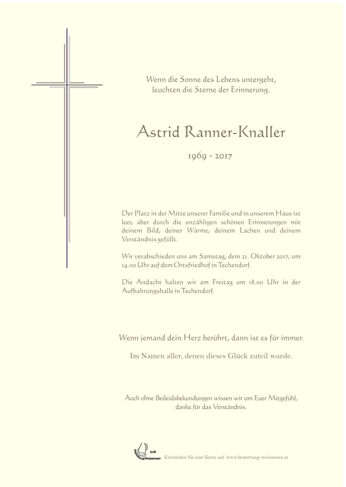 Wir sind so sehr betroffen über die traurige Nachricht von Astrid. Doch Ihr seid nicht allein, auch wenn in diesen schweren Stunden unser Trost nur darin besteht, liebevoll zu schweigen und schweigend mitzuleiden. Wir, besonders aber Oma, werden sie sehr vermissen.19.10.2017 21:59 - Fam. Obereder