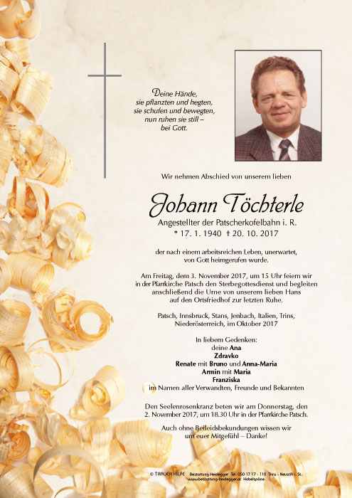 Bestattung wurde durchgeführt von: Karl Neurauter Karl Neurauter Bestattung Heidegger Brennerstraße 69 6150 - Steinach am Brenner Tel.: 05275 5211 zum Bestatter