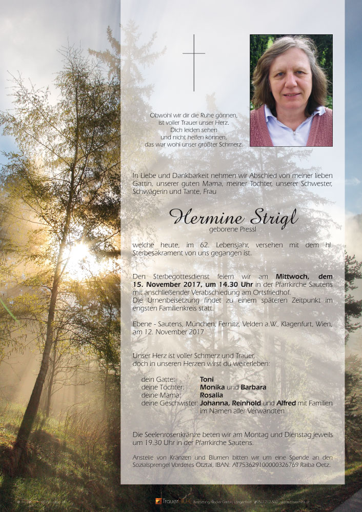 • Einen geliebten Menschen zu verlieren, ist schwer. Wir fühlen mit Euch. Möge Gott Eure geliebte Hermine zu sich heimholen und ihr das ewige Glück schenken. Auch Euch möge Gott in Eurem Leid beistehen.