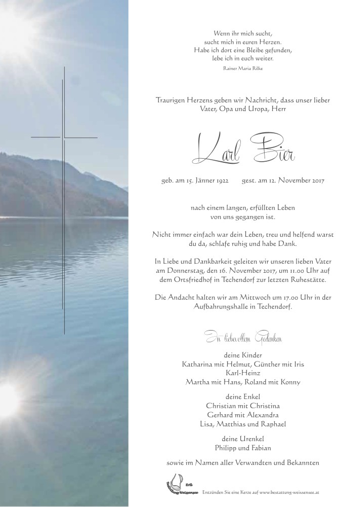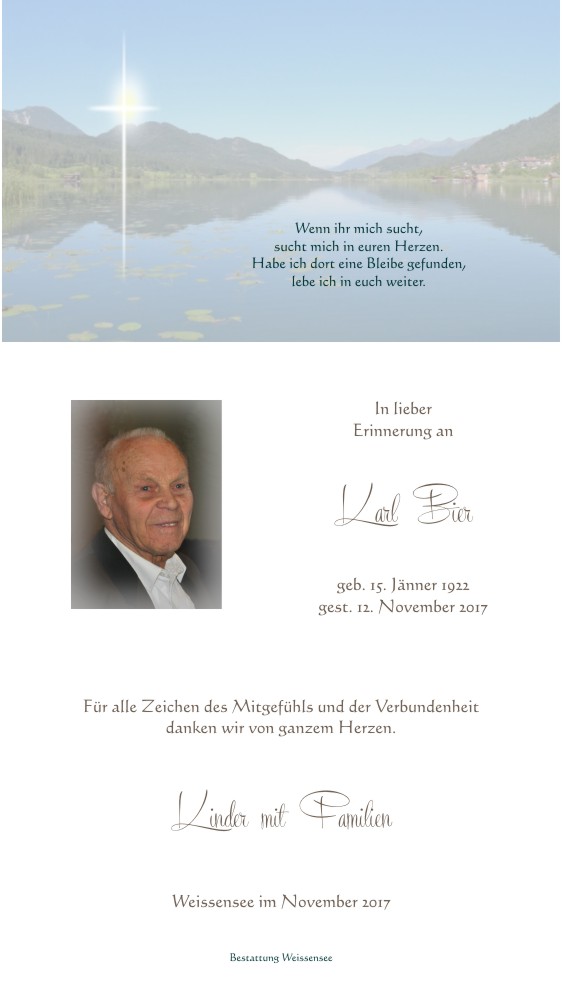 Bestattung wurde durchgeführt von: Markus Ertl Bestattung Weissensee Neusach 26 9762 - Weißensee Tel.: 04713 22 29 zum Bestatter