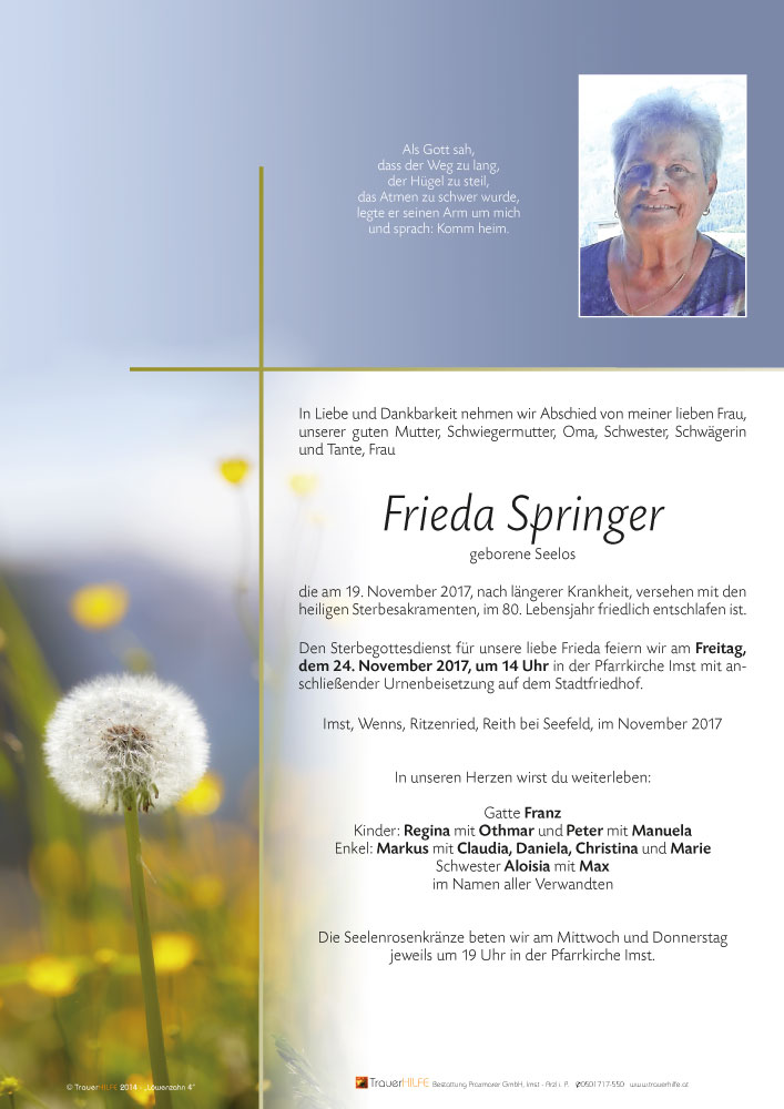 Zum Ableben eurer geliebten Frau und Mama möchten wir unser aufrichtiges Beileid aussprechen. Tante Frieda wird uns in Erinnerung bleiben als ein fröhlicher und lebensbejahender Mensch. Es schmerzt sehr, dass sie in ihren letzten Lebensmonaten so viel mitmachen musste. Trotz allem sind wir Gottes Kinder und alles ist in seiner Hand, sein Wille geschieht, auch wenn wir es nicht verstehen. Und irgendwann - in einer besseren Welt - gibt es ein Wiedersehen.