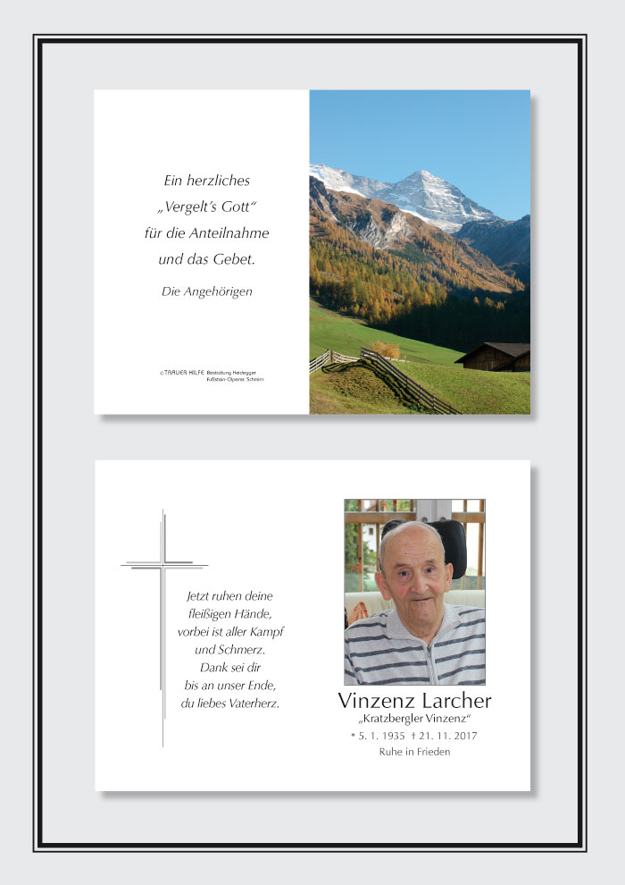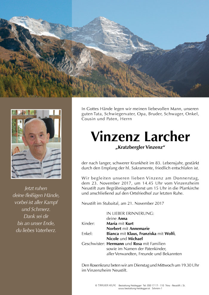 sei Alles gelegt. Liebe Trauerfamilie. Wir wünschen euch viel Kraft für die Zukunft. Möge Vinzenz in Frieden ruhen
