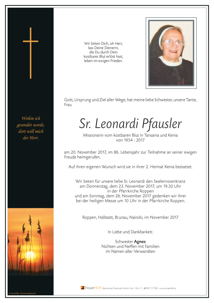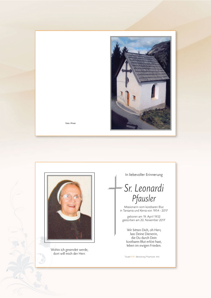 Neue Kerze für Sr. Leonardi Pfausler entzünden.