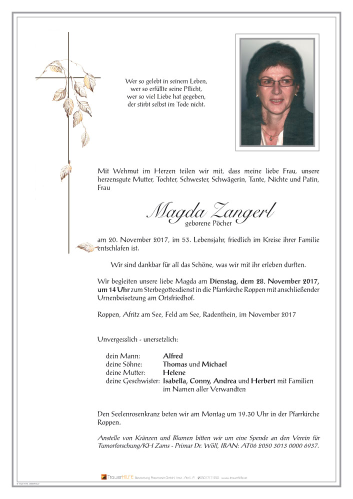 Zum tot deiner lb magda herzliches beileid fredl erika auer(siegele) aus zams