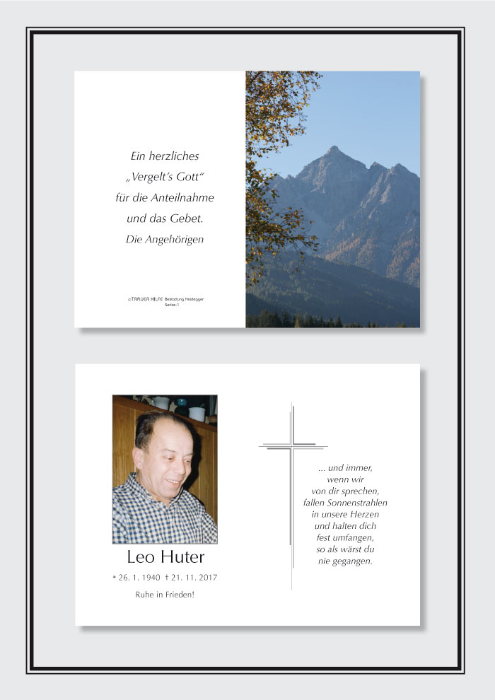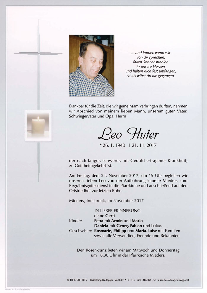 Bestattung wurde durchgeführt von: Karl Neurauter Karl Neurauter Bestattung Heidegger Brennerstraße 69 6150 - Steinach am Brenner Tel.: 05275 5211 zum Bestatter