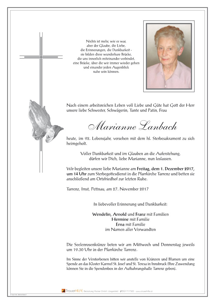 Meine aufrichtige Anteilnahme zum Heimgang von Marianne. Ich erinnere mich noch gut an die vielen netten Stunden beim Kirchenchor Tarrenz.