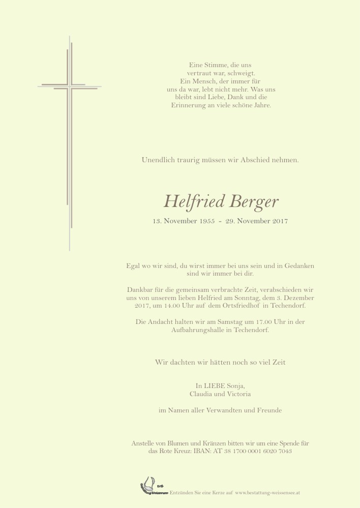 Fassungslos haben wir die Parte vom Tod Herrn Bergers gelesen. Wir möchten Ihnen unser tiefes Mitgefühl ausdrücken und sind in Gedanken bei Ihnen! Mit lieben Grüßen! Fam.Kaiser11.12.2017 09:55 - Fam.Kaiser